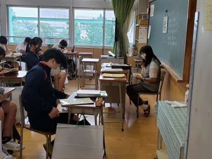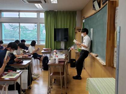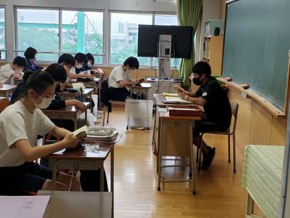 砧中、普段通りの朝が始まりました。 今朝は朝読書中の先生の様子を紹介します。健康観察票のチェックが終わると、生徒たちと一緒に本に向き合います。先生たちが何の本を読んでいるか、ちょっと気になりますね。