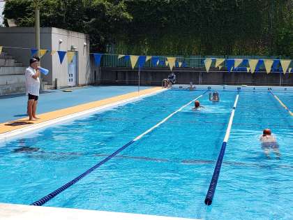 例年と比べて、プールに入る機会は相当少なくなりましたので、まずはしっかり水に慣れることが大切です。絶好のプール日和。部員たちの歓声が蝉の声と溶け合っています。