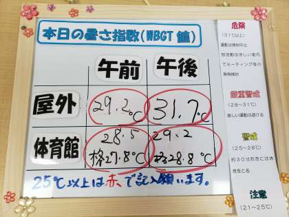 本日の暑さ指数(WBGT値)が校庭で31.7度と測定されました。31度以上で運動は原則禁止の基準のため、午後の校庭での部活動を中止と判断しました。関係の部活動には現在、連絡網を通じてお知らせをしています。