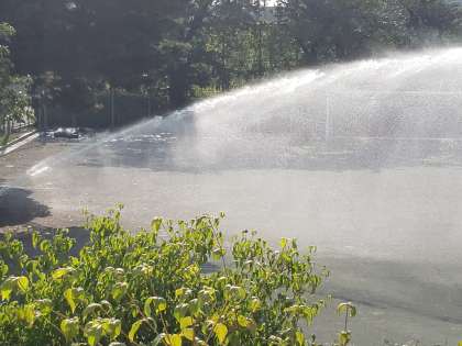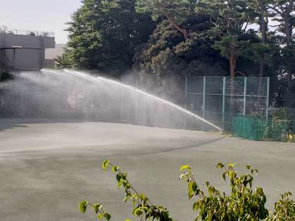 晴れの日が続き、校庭の砂ぼこりが気になり始めました。午前中の校庭での部活動のためにスプリンクラーを作動しました。間もなく部活動の生徒たちが登校します。