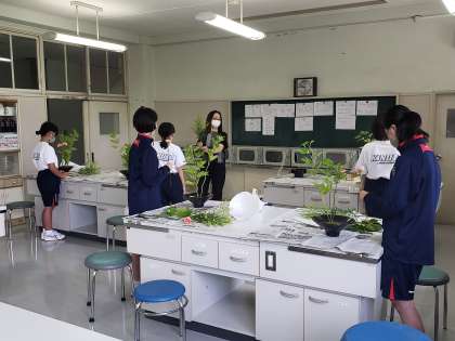 日本文化部、本日は華道体験です。バランスや空間の生かし方などを考えながら、剣山に活けていきます。