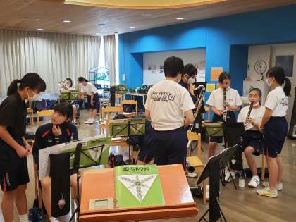 吹奏楽部は今日も分散練習。3年生の各教室とランチルームを使って個人練習が続きます。1年生にも丁寧に教えています。