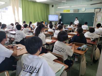 1年生社会。夏休みの課題だった世界の国々の調べ学習を一人ひとりが発表しています。プレゼンの見事さに、こんな時代だからこそ「早く行ってみたい」と思えてきます。