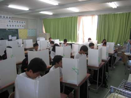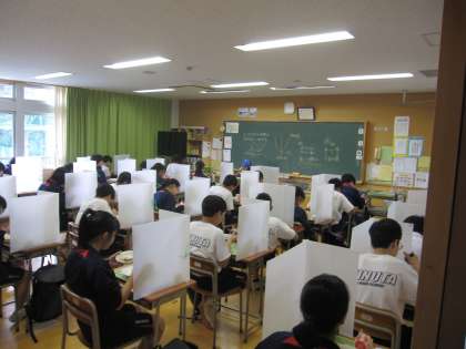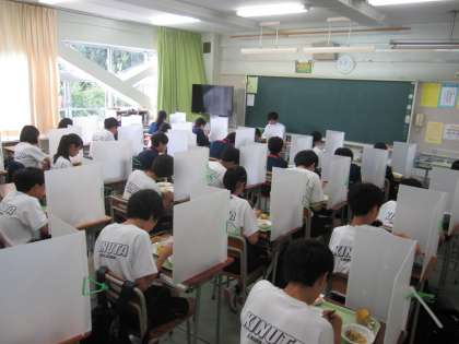 給食中の様子です。今学期もおかわりの時は生徒でなく教員が盛り付けるようにしています。副校長