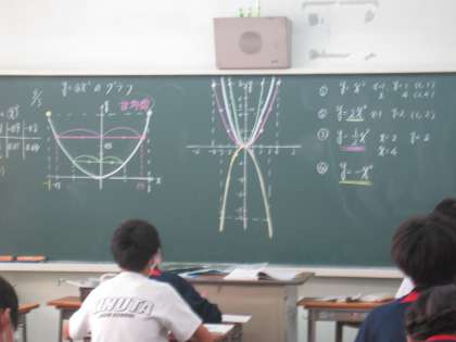 2乗に比例する関数のグラフの特徴について学びます。副校長は中学時代、先生の描くグラフが美しく、どうしてだろうと家で何度も練習しました。さらに定規を作れば上手に描けると思い、描いたグラフをプラスチック板でなぞり、放物線定規を作ったことを思い出します。せっかく作った定規もaの値によって開き具合が違うので汎用性がないのだと後で気づきました。副校長