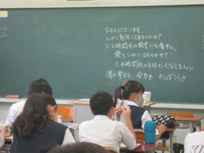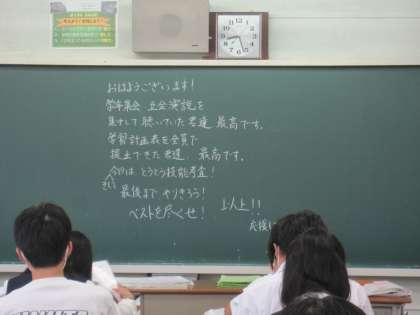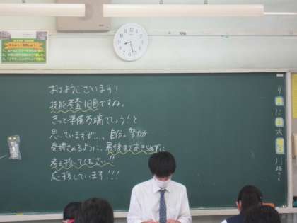 今朝の黒板メッセージは、技能考査への担任からの温かい応援メッセージです。ほとんどの生徒が試験勉強をしていました。(副校長)