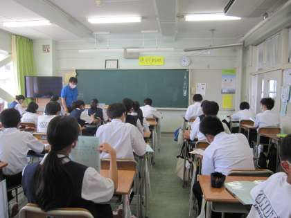 1年生のあるクラスは、キャリアパスポートを作成していました。キャリアパスポートとは、生徒の学習活動の振り返りやキャリア教育に関わる活動について、小学校から高等学校まで目標設定と振り返りを行っていくものです。自分の良さ認め将来への見通しが持てるよう、教員や保護者が対話的に関われるようになっています。(副校長)