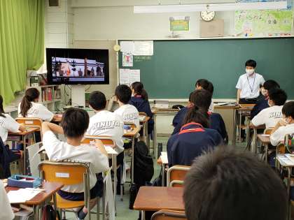 2年生社会は室町文化について。中学生には馴染みの少ない能楽について、映像で紹介していました。