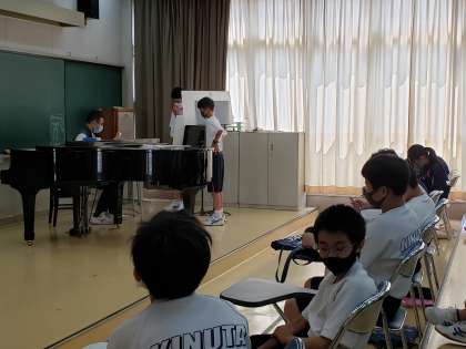 1年生音楽では歌のテストを。歌う場面では配慮が必要です。順番を待つ生徒たちは小さい声で口ずさんでいました。