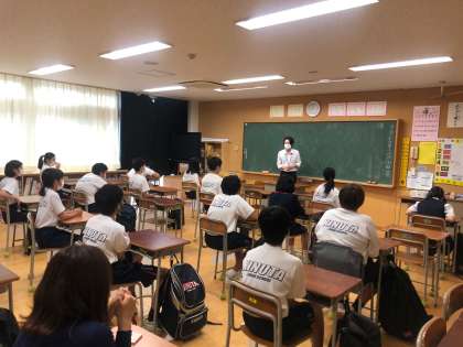 今年度は2名、1年生の国語と3年生の体育を担当します。今年度は受け入れにあたって大学側と打ち合わせを十分に行い、感染症予防への協力に加えて、生徒の授業時数確保の観点から、実習生による授業実践を大幅に縮小することになりました。そういった制約が多い中でも、初日から精力的に頑張ってくれています。
