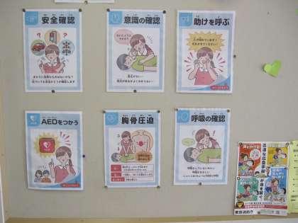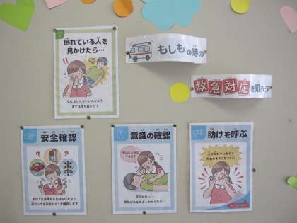 保健室前には、時期に合った健康・安全に関する掲示物があります。今日紹介するのは「もしもの時の救急対応を知ろう」です。倒れた人を見つけたら、その場に居合わせた人による救急救命が大切です。(保健室)