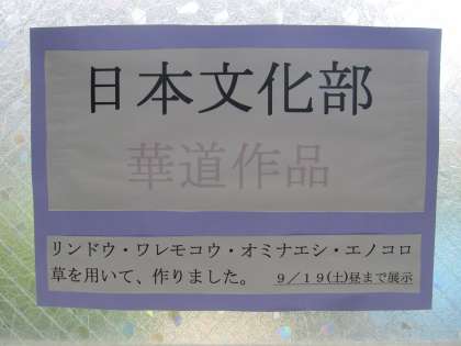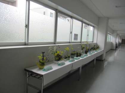 日本文化部が生け花の展示を行っています。今朝から明日の11時30分まで、視聴覚室前の廊下に展示していますので、どうぞお越しください。