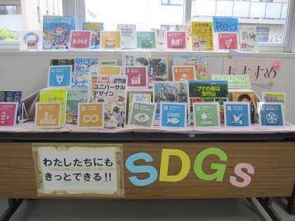 職員室前の図書コーナーのテーマが「SDGs」になりました。1年生の教科「日本語」でもSDGsについて考えます。どうぞ、気になる図書を手に取ってみてください。(図書館司書)