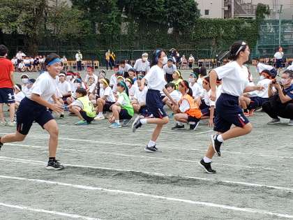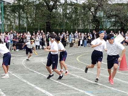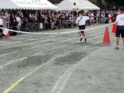 1・2年生の全員リレー。バトンパスの練習も決して十分とは言えませんが、これこそ学級のチームプレーです。繋いで繋いで、ゴールはもうそこです。