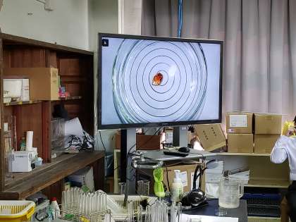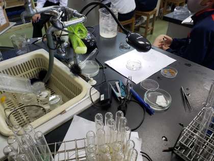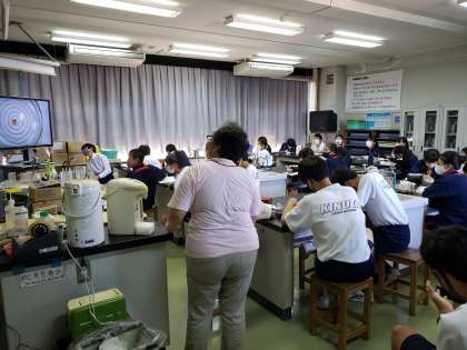 コーヒーシュガーの溶解の様子を9分間観察して、スケッチしていきます。教卓での実験をスクリーンに拡大して、変化の様子を詳細に記録していきます。変化が起こるたびに生徒からどよめきが聞こえています。物質が溶ける様子をじっくりと見る機会は日常生活ではそれほどありません。日常で繰り広げられる不思議な世界を体感しました。