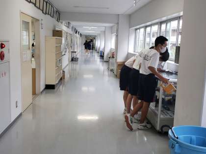これまで感染症対策のため、校内清掃を教職員で行ってきました。本日より国などのガイドラインを参考にして、生徒による清掃活動を行います。当面の間は掃(は)き清掃となります。消毒、拭き(ふ)き清掃は引き続き教職員が担当します。