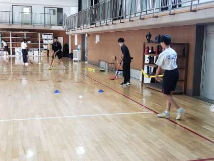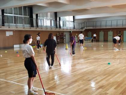 I組生徒は先ほどまで7分間のシャトルランに取り組んでいました。11月27日(金)に開催される連合マラソン大会に向けての練習です。ハードな練習の後のユニバーサルホッケー、生徒たちの笑い声が聞こえてきます。先生たちも一緒になって楽しそうです。