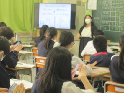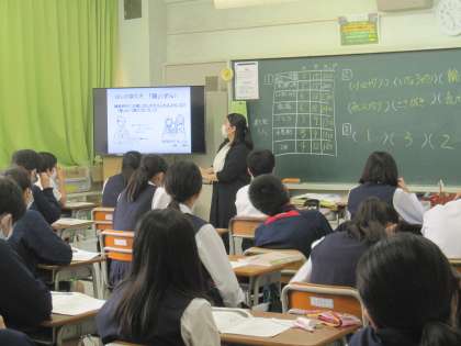 2年生家庭科では、食文化について学んでいます。和食の学習はオリパラ教育にも位置づけられています。箸の持ち方や箸の持ち上げ方をペンを使ってやってみました。社会に出るまでに、このような所作が身につくといいですね。(副校長)