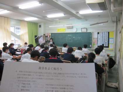 1年生のキャリア教育です。「自分をよく知ろう」というワークシートを活用しながら自己分析をしていきます。自分の性格や自分が好きなことについてじっくりと考える機会をもつことが、自分の将来を考える上でとても大切です。これからも、様々な機会を利用して、キャリア教育を行っていきます。(1学年)