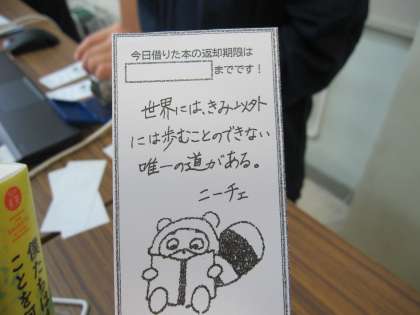 図書館では、図書を借りた人に返却日をお知らせするしおりを渡しています。前期の図書委員が選んだ名言が書かれています。ちょっとした心遣いのおかげで読書タイムを豊かにしてくれています。