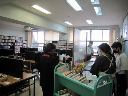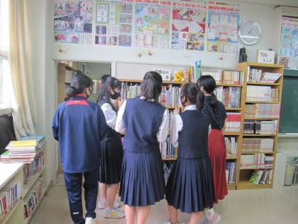 絵本のコーナーでは国語の教員と生徒が絵本選びをしています。この絵本は家庭科の課題に使うようです。いい本が見つかりますように。(副校長)
