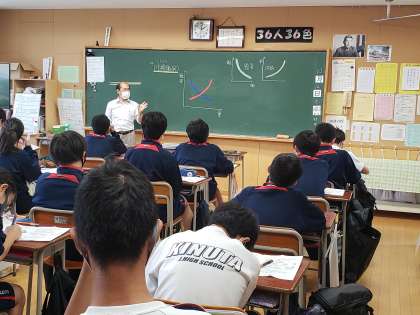 3年生社会では経済の需要と供給について。曲線を使って市場価格が決まる仕組みを学んでいます。