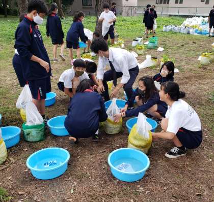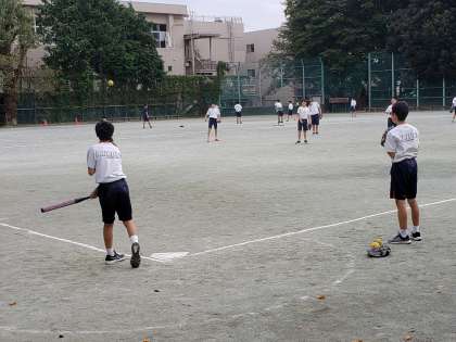 校庭では2年生体育。ソフトボールのノック練習を行っていました。ミスをすると仲間から「1年生が見てるぞ!」の声が。大根栽培の1年生の手前、華麗なプレーを披露したいところです。