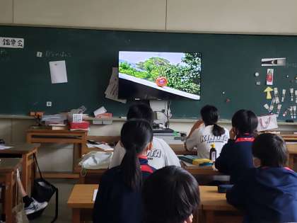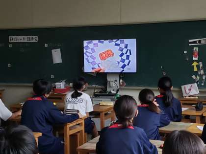 夏休みの課題で仕上げた生徒作品をスライドショーにして紹介しました。生徒たちは自分の作品が登場すると照れながらも嬉しそうです。