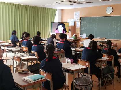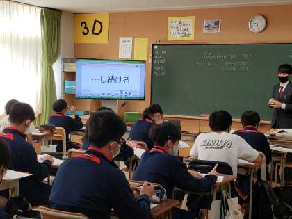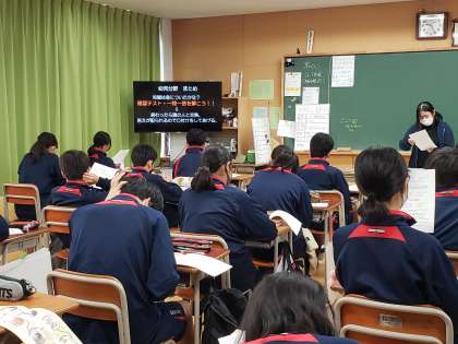 3年生の各教室では、たまたまディスプレイを活用した授業が行われていました。授業を観察してみると、教科によってその使い方にも特徴が現れてきます。写真は英語、家庭科、国語の様子です。生徒の思考の流れに沿って示す方法、ストーリーとして理解するために見せる方法、強調したい点を繰り返し映す方法など、同じディスプレイでも使用目的が異なっていました。どの方法も映像として効果的に提示することで、生徒の理解を深めることができればと思っています。