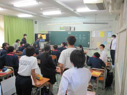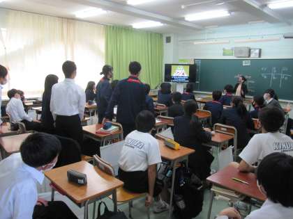 2年生英語で標識を見ながら「〜してはいけない、〜しなければならない」という表現を学んでいます。テレビに映し出された標識をみて、何といえばよいのかをスピーディーに班対抗で答えます。班対抗となるとみんなのってきます。静かに集中する場面と、楽しむ場面の切り替えが素晴らしいです。(副校長)