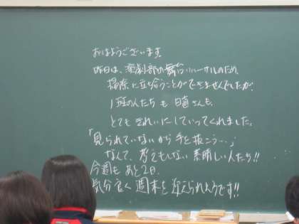 黒板には、担任からの温かいメッセージがあります。係活動や当番活動で自主的な行動がとれています。さすが、2年生です。
