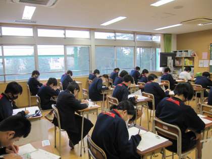 今日、3年生は区の学習習得確認調査に取り組んでいます。定期テストとは違い、広範囲からの出題になりますので、今までの受験勉強の成果が試されます。みんな真剣です。