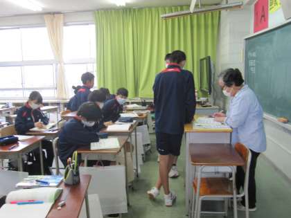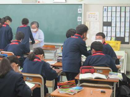 1年生がワークを使って光の屈折の学習をしています。作図は難しくて、正しく描いたつもりでもずれてしまうことがあり、教員が一人一人の作図の確認をしています。友達同士の教え合いがクラスのあちこちに見られます。聞いただけではなかなか身につかなくて、人に教えることができたら完璧とよく言います。ちょっと騒がしくなるかもしれませんが、生徒同士の学び合いで得られるものは大きいです。