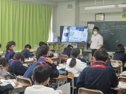 1年生社会科で、実物投影機を使っています。生徒と同じ資料集を映し出すことによって、資料集のどこを見ればよいのか分かります。