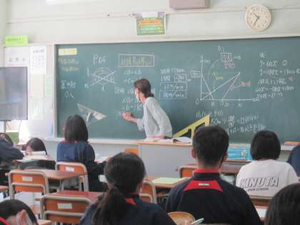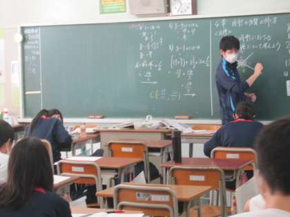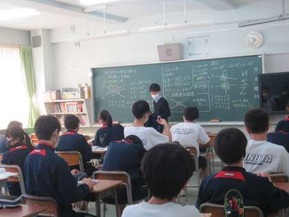 2年生 数学では少人数授業で「対頂角は等しい」ことについて学習しています。体験的には等しいとわかっていることを数学では証明して、明らかにしていきます。これが数学の面白さなのですが…、数学を苦手と感じる場面かもしれません。少人数で丁寧に学習していきます。(数学科)