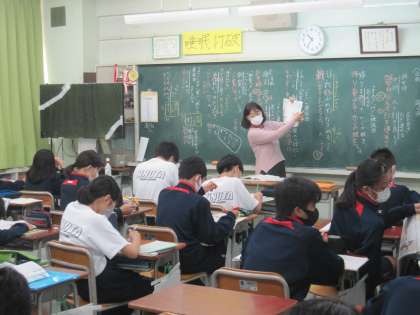 1年生の国語では古文「竹取物語」の現代語訳を学習しています。はじめのうちはとても難しくて、教員が訳を示していましたが、今では、この黒板のように生徒自らが訳すことができるようになっています。地道な学習の積み重ねが着実に力となっています。1年生の粘り強く学習する姿勢は素晴らしいです。(副校長)