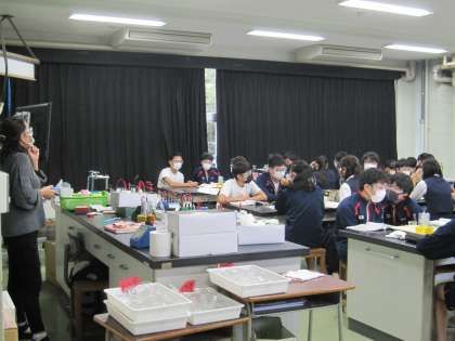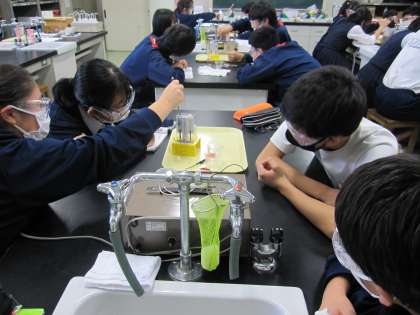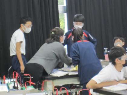 3年生が理科室で実験をしていました。塩酸を電気分解して発生した気体の性質を調べるためにマッチの火を近づけました。普段の生活でマッチを使うことがないのでちょっと緊張した面持ちでした。