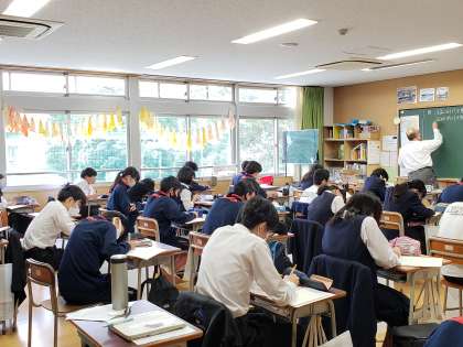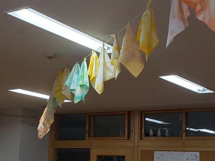 3年生の各教室では、美術で製作した黄色いハンカチを展示しています。映画『幸福の黄色いハンカチ』の感動のラストシーンを思い出しました。生徒たちにも幸せが訪れますように。
