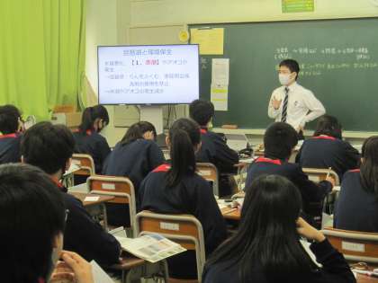 2年生、社会科「都市と郊外」の学習をしています。上の写真の場面は琵琶湖の水質改善について学んでいるところです。