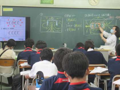 下の写真は理科です。磁界と電流について学んでいます。コイルに電流を流したときのコイルの中の磁界の向きは右手を使うと分かりやすいということを学習していました。みんな集中して取り組んでいます。(副校長)