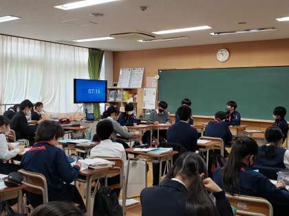 3年生国語でのグループディスカッション。話し合いを行う生徒を制限しながら、参観生徒も議論の進め方を客観的に学べるようにしています。最終的には全員がディスカッションできるよう計画しているそうです。このグループディスカッションは高校入試での集団討論面接にも役立ちますね。