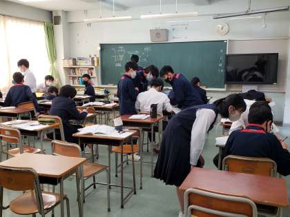3年生数学では証明の方法をお互いが教え合っています。自分ならこういう条件を使って証明したい、と伝え合うことで、多様な解決方法を学ぶことができます。少人数指導を取り入れている数学だからこそ、密状態を避けての話し合いが可能となります。