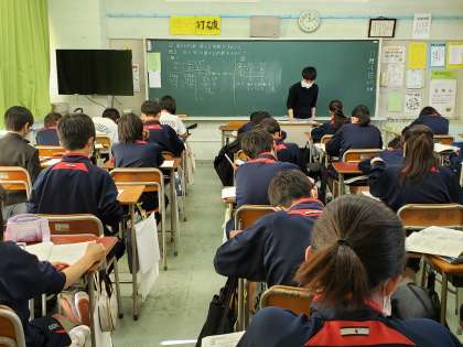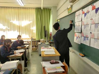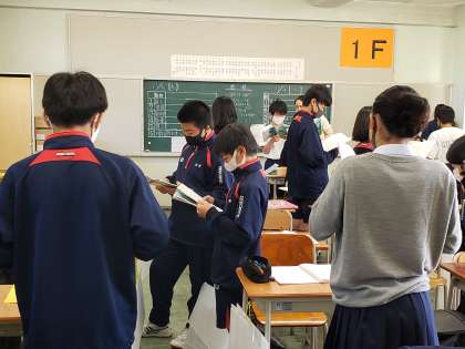 1年生英語は「Which〜」を使った文章表現を学習中。会話学習は立って行っていました。この使い方ができるようになると会話の幅が広がりますね。