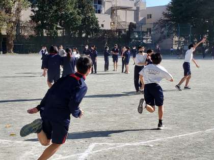 秋晴れの昼休み、今日も元気に校庭で走り回っています。I組では先生が鬼ごっこの「鬼」。なんと先生は陸上部の顧問でもあります。本気になって追いかけてくると、逃げるのも簡単ではありません。