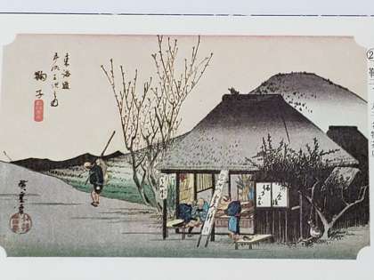 15日目で静岡県丸子の宿場を通過しました。江戸時代後期作の浮世絵(錦絵 歌川広重 作)と全く変わっていない風景を発見しました。茶店は名物のとろろ汁を400年以上にわたり、今も旅人に提供しています。江戸時代初期〜中期頃の俳人、松尾芭蕉が(梅若菜 丸子の宿の とろろ汁)と詠んだ俳句そのままの光景でもありました。