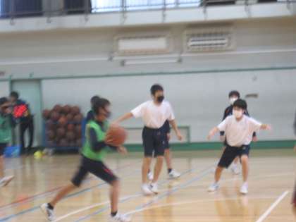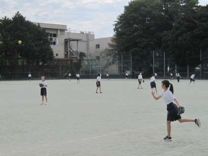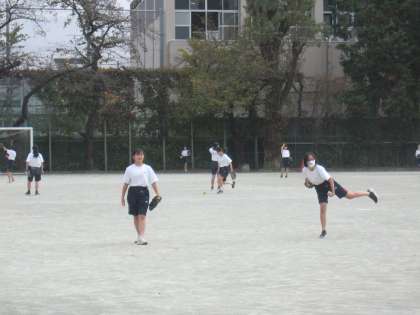 1年生男子は体育館でバスケットボールの対戦を行っています。スピーディーな動きです。女子は校庭でソフトボールをしています。グローブをつかったり、大きなソフトボールをあつかう機会が少ないので難しそうですが、全身を使って思いっきりボールを投げています。うまくグローブに入った時はうれしいですね。(副校長)