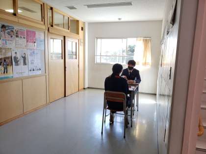 3年生英語では、個別に英語での面接を行っています。日本語の面接でも緊張するものですが、英語となると尚更です。まずはALTの先生との積極的な会話を通して、英語でのコミュニケーションのハードルを下げておくことがポイントかもしれませんね。