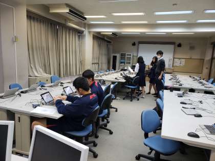 パソコン室では3年生がプログラミングに取り組んでいました。授業内ではできなかったので、補習だそうです。少ない人数で教科担任の先生にも質問しやすい雰囲気のようです。作業も捗りますね。