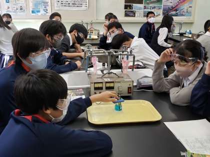 3年生理科では塩化銅水溶液の電気分解の実験中。水溶液の変化も観察します。もちろん全員ゴーグルは着用です。さて電極にはどんな変化が見られたでしょうか。