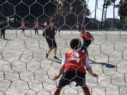 2年生体育、サッカーの試合中。キーパーに「サッカーはどうですか?」と尋ねてみると「試合は楽しいです」との答えが。あっ!話しかけている間に攻め込んでこられました。スミマセン(反省)。